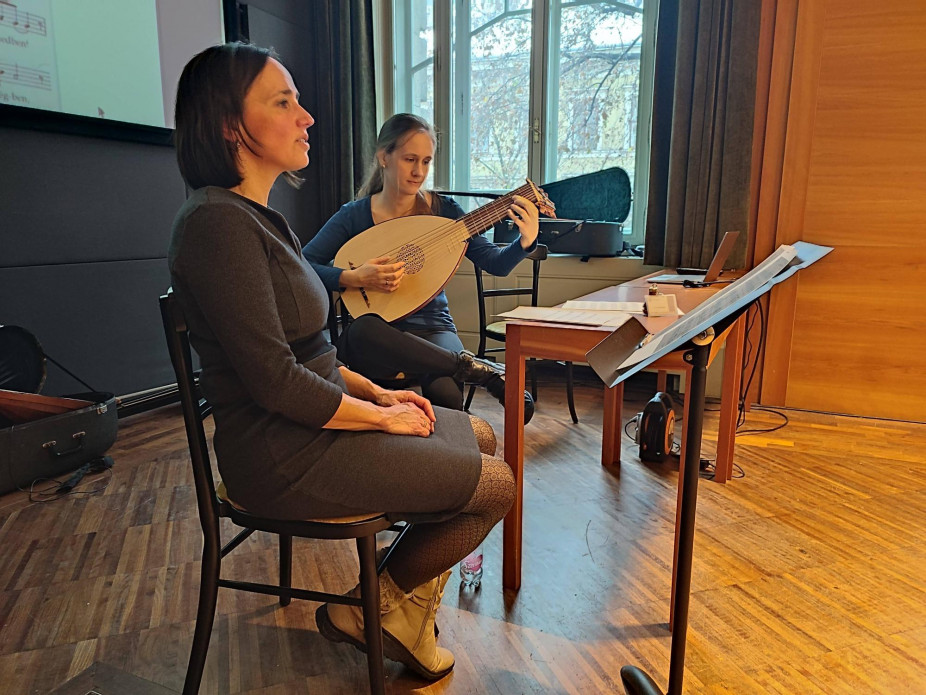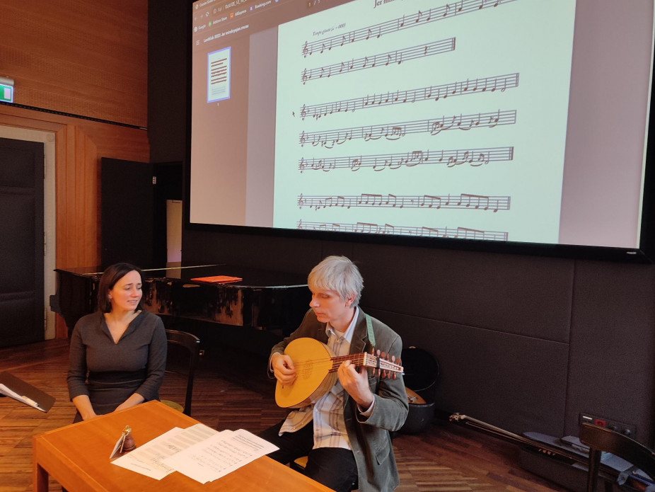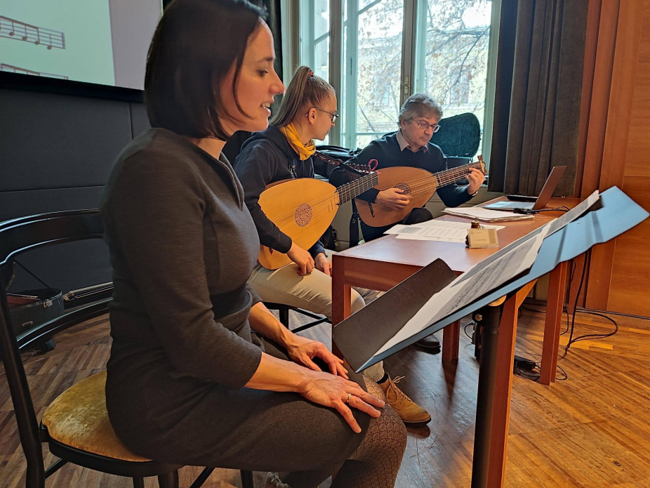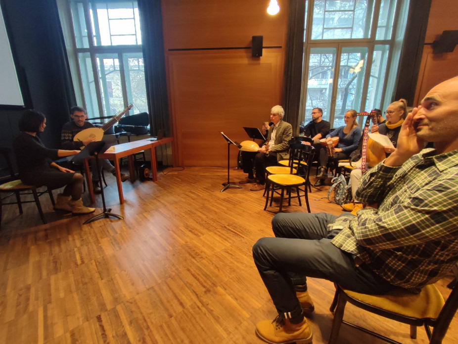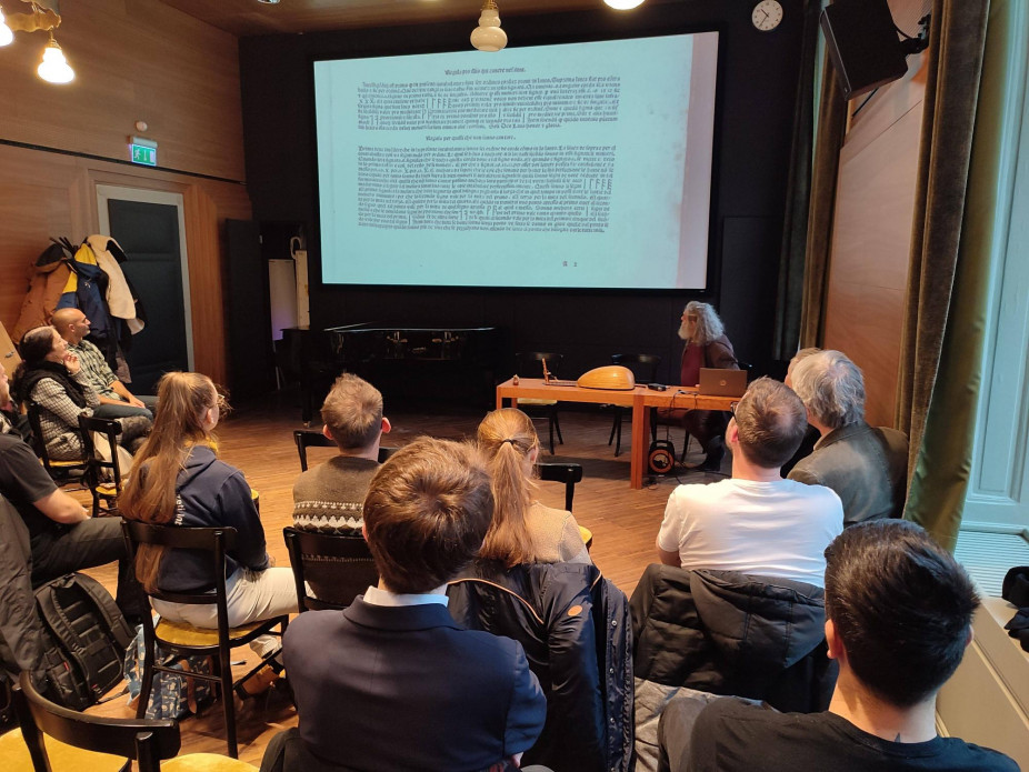 Davidovics Igor hangszertörténet és játéktechnika összefüggéseit bemutató előadása mellett a barokk számozott basszus gyakorlatába is bevezette a jelenlévőket. Kiemelte, hogy egy gitáros könnyen megtanulhat barokk theorbán muzsikálni, hiszen öt húr hangolása megegyezik, szimpla húros és körömmel pengették. Nagy Csaba az éppen aktuális koncertanyaga kapcsán ismertette Francesco Spinacino műveit és a Petrucci lantkönyvek érdekfeszítő történetét. Kónya István a virágénekek, népénekek, zsoltárok és históriás énekek hiteles kíséretéről beszélt, majd beszámolt a Pécsi Tudományegyetemen idén indult lanttanári kurzus részleteiről. Végül Bognár Szilvia népdalénekes segítségével a gyakorlatban próbálhatták ki a vállalkozó kedvű jelentkezők a történeti énekek és népénekek kíséretét. A pontosan leírt hangokhoz szokott muzsikust komoly feladat elé állítja a improvizációs elemeket tartalmazó, stílushű kíséret megalkotása és a parlando-rubato előadásmód mindig változó, szöveghez alkalmazkodó agogikája. A lant mellett a koboz is megszólalt, valamint szó esett a harmonizálási elvekről és lehetőségekről is.