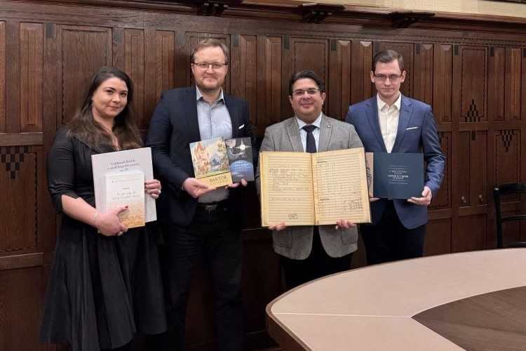 Laskai Anna, az OSZK osztályvezetője, Rózsa Dávid, az OSZK főigazgatója, Farkas Gábor, a Zeneakadémia rektora és Cselényi Máté, a Liszt Múzeum igazgatója (Fotó: OSZK)