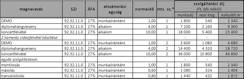 VII. Az Audiovizuális és Színháztechnikai Osztály (AVISO) által a hallgatók számára térítés ellenében nyújtott szolgáltatások